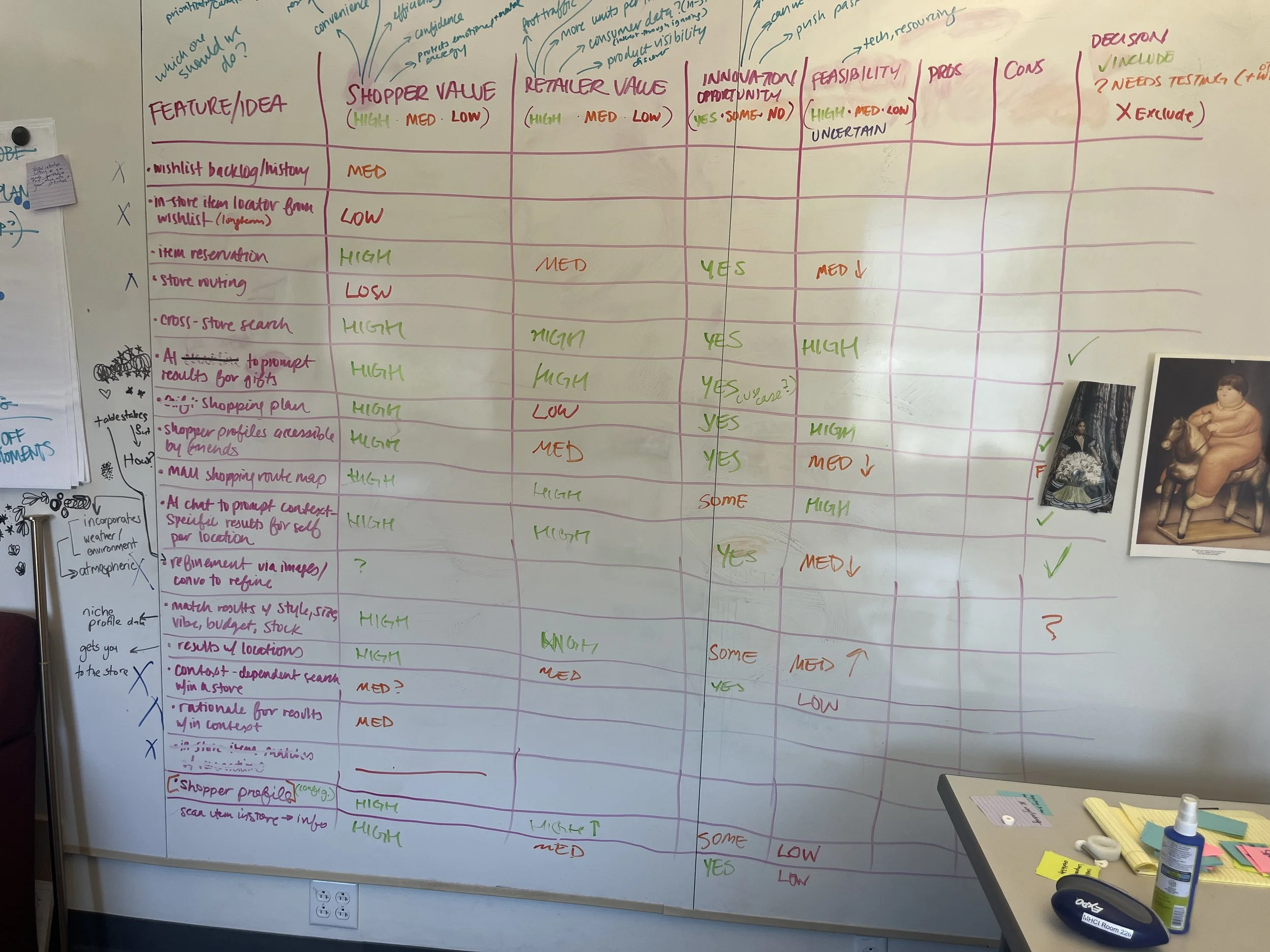 As a team, we completed a feature matrix to define the core components of our solution. We placed all the distinct qualities from each of the four concepts into a chart. We weighed factors such as shopper value, retailer value, innovation opportunity, and feasibility against each other.
